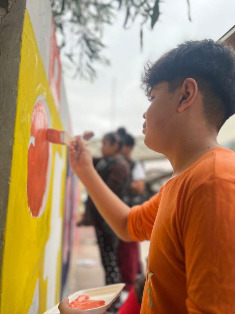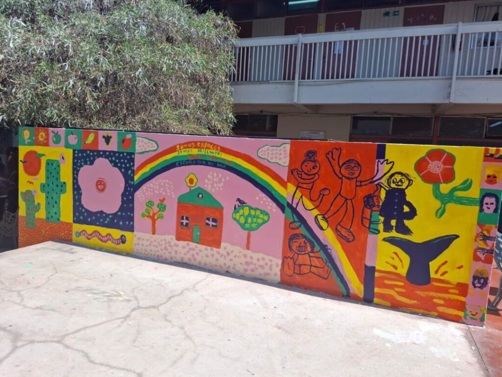 “Territorio de Recados” finalizó con la construcción colectiva de un mural a cargo de los estudiantes de la Escuela Especial Flor del Inca de Iquique, quienes destacaron la frase “Somos capaces, somos brillantes, podemos lograr muchas cosas” en medio de un paisaje multicolor con una casa, un arcoíris y flora y fauna local.