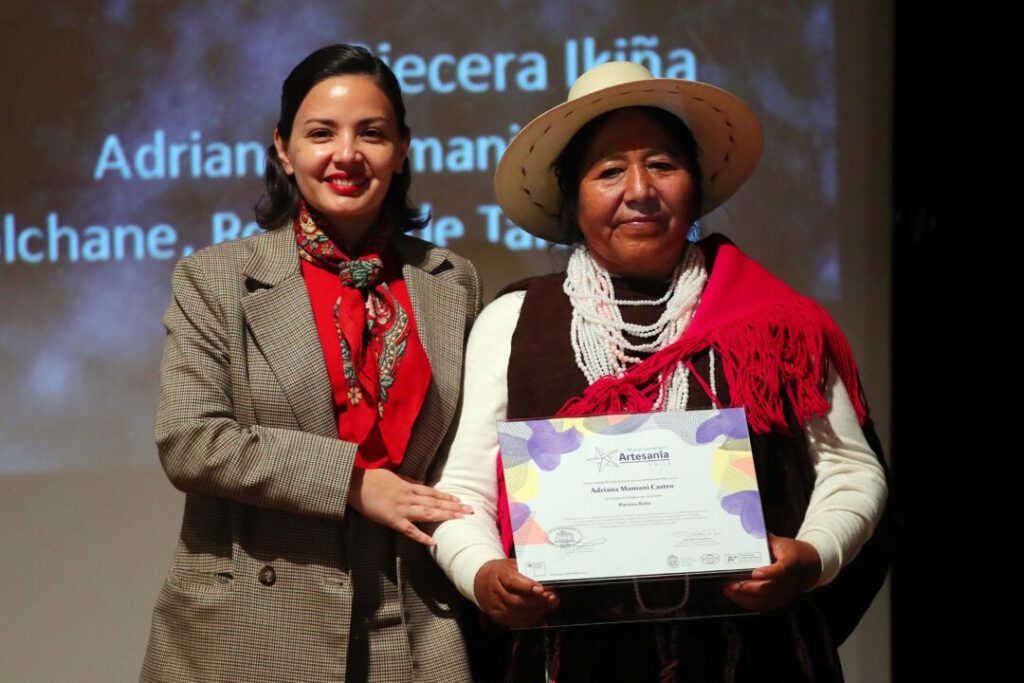 Las cultoras Adriana Mamani Castro, de la comuna de Colchane y Pilar Quispe Mamani de Pozo Almonte recibieron el premio “Sello de Excelencia a la Artesanía”, reconocimiento otorgado por el Comité Nacional de Artesanía, integrado por el Área de Artesanía del Ministerio de las Culturas, las Artes y el Patrimonio, y la Escuela de Diseño de la Pontificia Universidad Católica de Chile, a través de su Programa de Artesanía, con el patrocinio del Consejo Mundial de Artesanías (WCC) y de la Oficina UNESCO Santiago.